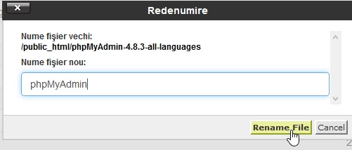 - tiks izveidota jauna mape ar attiecīgā arhīva nosaukumu, bet bez .zip paplašinājuma, kas parādīsies public_html mapē. Šai mapei ir jāmaina nosaukums, lai paliktu tikai "phpMyAdmin". Nosaukuma maiņa tiek veikta, izvēloties attiecīgo mapīti un nospiežot "Pārdēvēt" pogu lapas augšējā joslā.