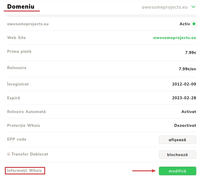 Piekļūstot domēnam, jaunatvērtajā lapā mēs piekļūsim sadaļai Domēns;- Šajā sadaļā WHOIS informācija sadaļa ir interesanta