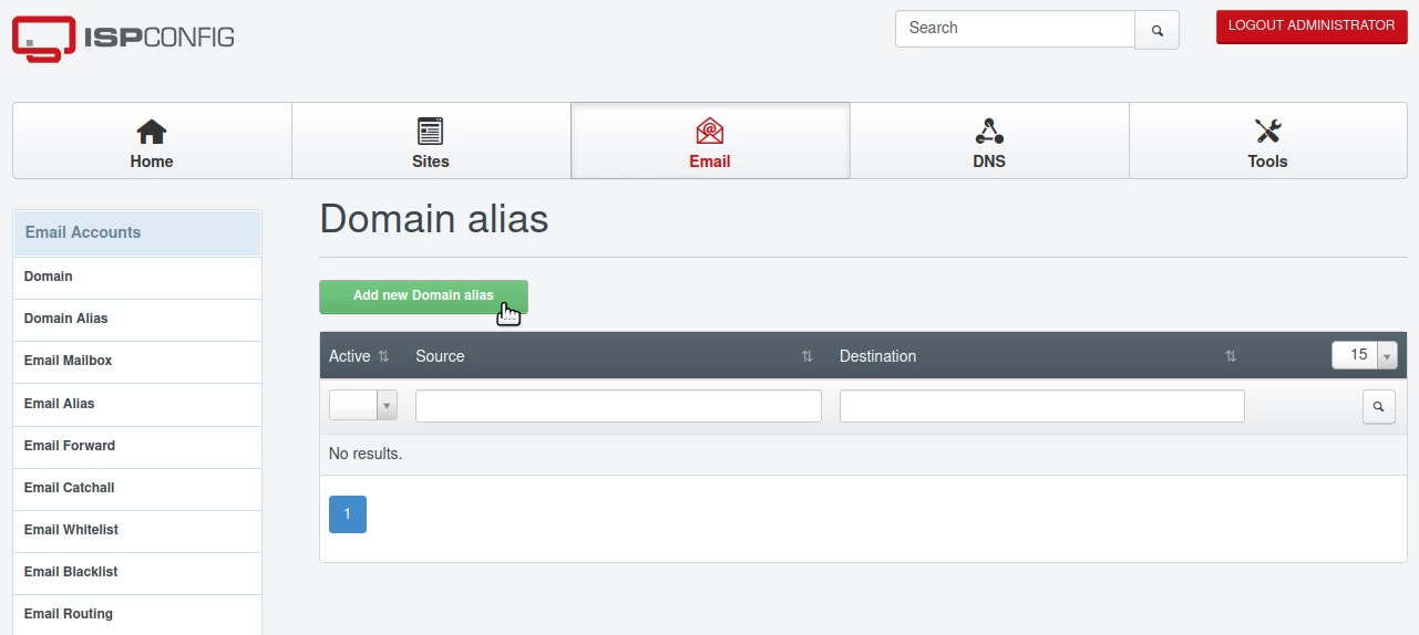 - Tālāk mēs noklikšķināsim uz Domēna alias izvēlnes no E-pasta konti kategorijas, pēc tam noklikšķināsim uz Pievienot jaunu domēna alias pogas.