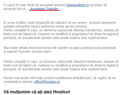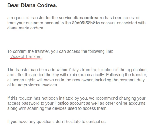 Saņēmējs saņems e-pastu uz Hostico klienta konta adresi, kurā tiks lūgts Apstiprināt pāreju.