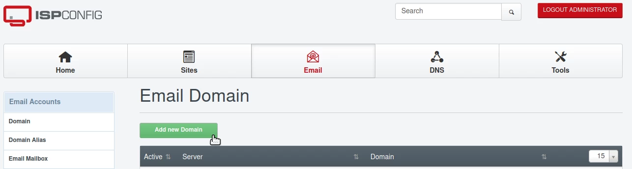 - ISPConfig piedāvā iespēju izveidot e-pasta kastītes, kas saistītas ar īpašumā esošajiem domēniem. Lai izveidotu e-pasta kastītes, vispirms būs jāpievieno domēns panelī, sadaļā Domēns zem E-pasta konti kategorijas.