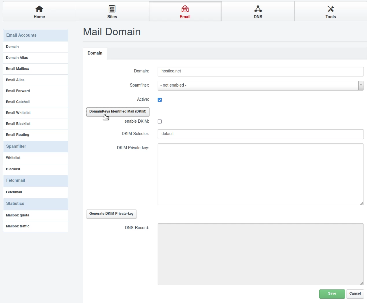 - Aktīvs: Mēs atstāsim izvēles rūtiņu; Ja mēs arī vēlamies iestatīt DKIM (spam/noziedznieku aizsardzība), mēs noklikšķināsim uz DomainKeys Identified Mail (DKIM) pogas; Ieteicams arī iziet šo soli;