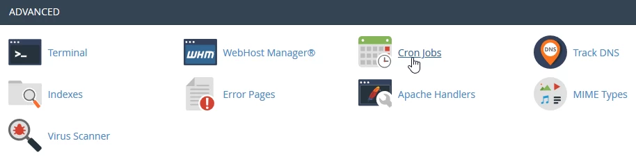 - Pēc pieteikšanās cPanel administrācijas panelī, meklējiet Advanced sekciju rādītajā logā un no turienes izvēlieties Cron jobs
