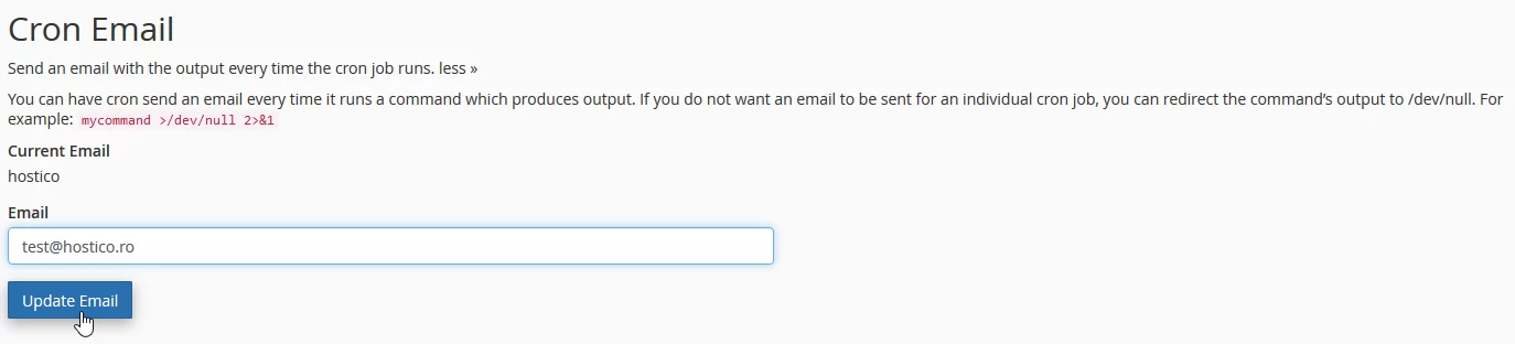 - Tālākajā lapā jūs varēsiet iestatīt e-pasta adresi, uz kuru jānosūta cron darba rezultāti, ja tādi ir nepieciešami, pēc tam nospiežot Atjaunot e-pastu pogu