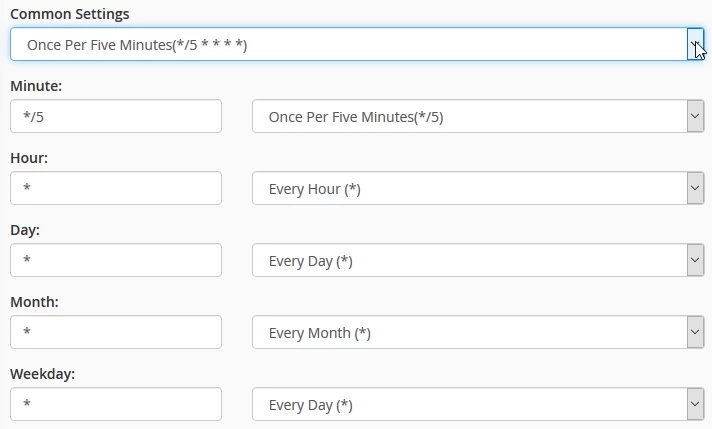 - Lai iestatītu cron frekvenci, jūs varat izvēlēties iepriekš noteiktu intervālu no Parastās iestatīšanas lauka vai manuāli iestatīt izpildes intervālu katrā laukumā.